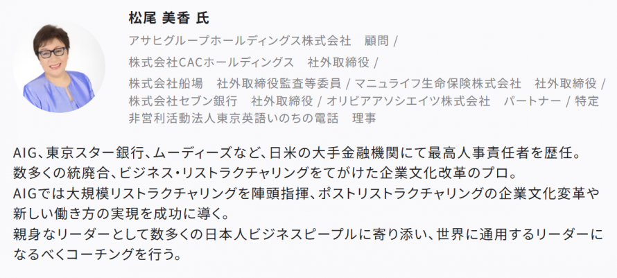 日米の大手金融機関にて最高人事責任者を歴任してきた、企業文化改革のプロである松尾 美香 氏が登壇。
