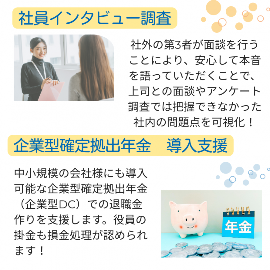 また、企業型拠出年金の導入を契機として、賃金制度の改定、就業規則の見直しなど、これまで気にはなっていたけれど手つかずだった経営課題の解決に取り組みましょう!