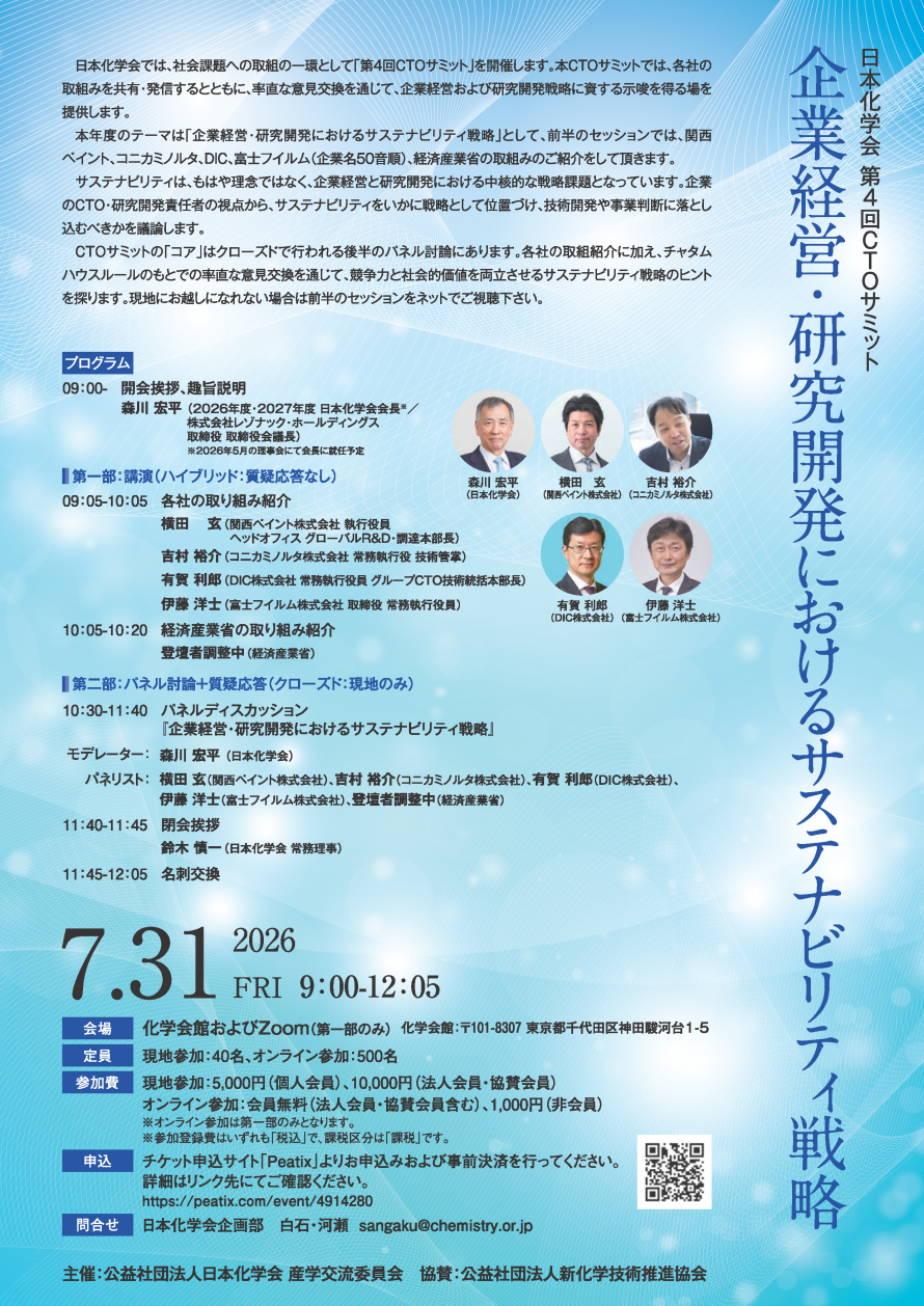 日本化学会では、社会課題への取組の一環として「第4回CTOサミット」を開催します。本CTOサミットでは、各社の取組みを共有・発信するとともに、率直な意見交換を通じて、企業経営および研究開発戦略に資する示唆を得る場を提供します。