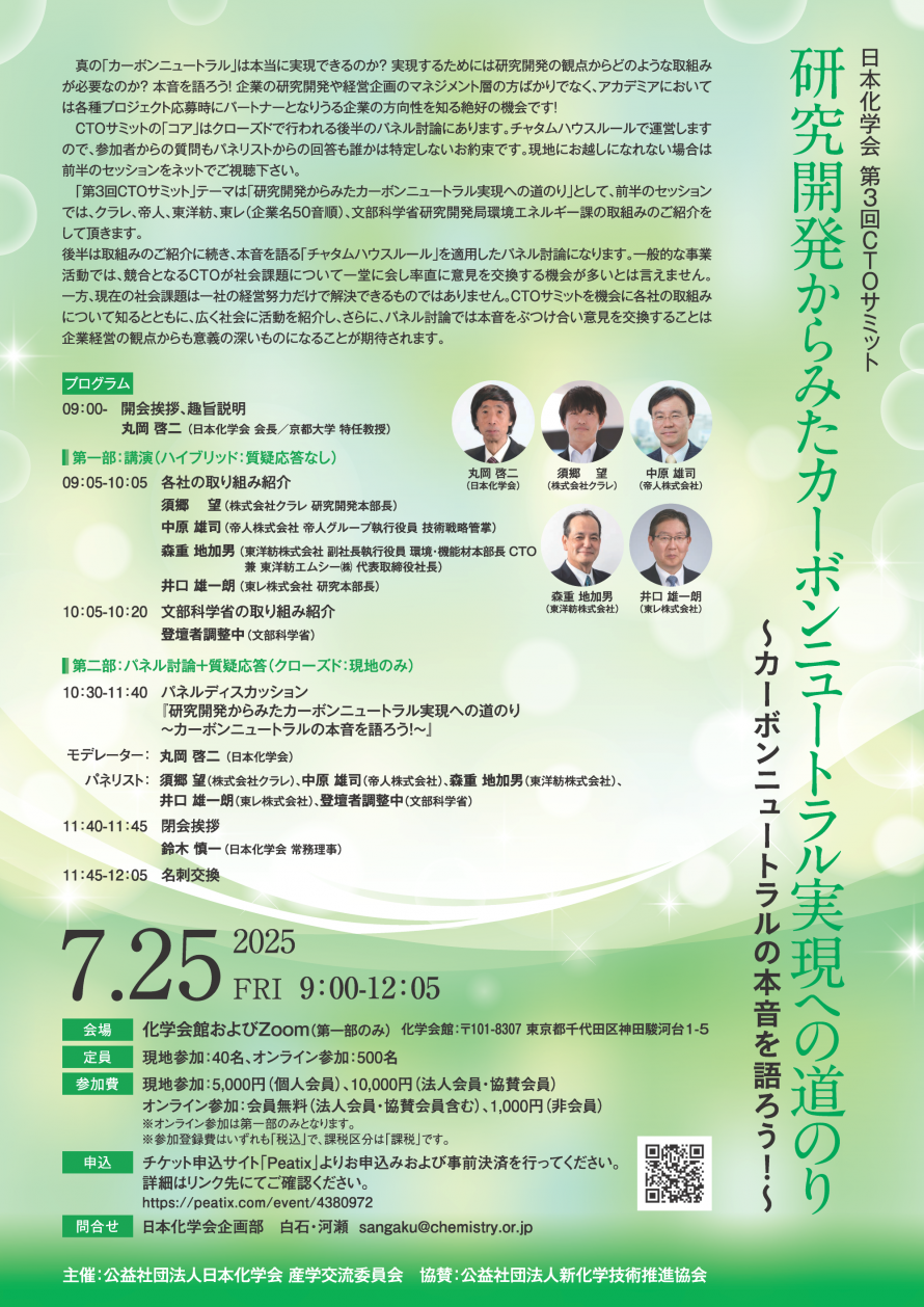 「第3回CTOサミット」テーマは「研究開発からみたカーボンニュートラル実現への道のり」として、前半のセッションでは、クラレ、帝人、東洋紡、東レ(企業名50音順)、文部科学省研究開発局環境エネルギー課の取組みのご紹介をして頂きます。