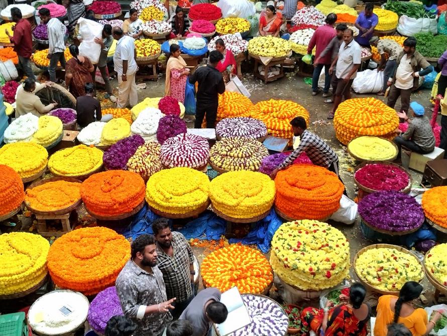 色とりどりの花で埋め尽くされるKRマーケット(ベンガルール)