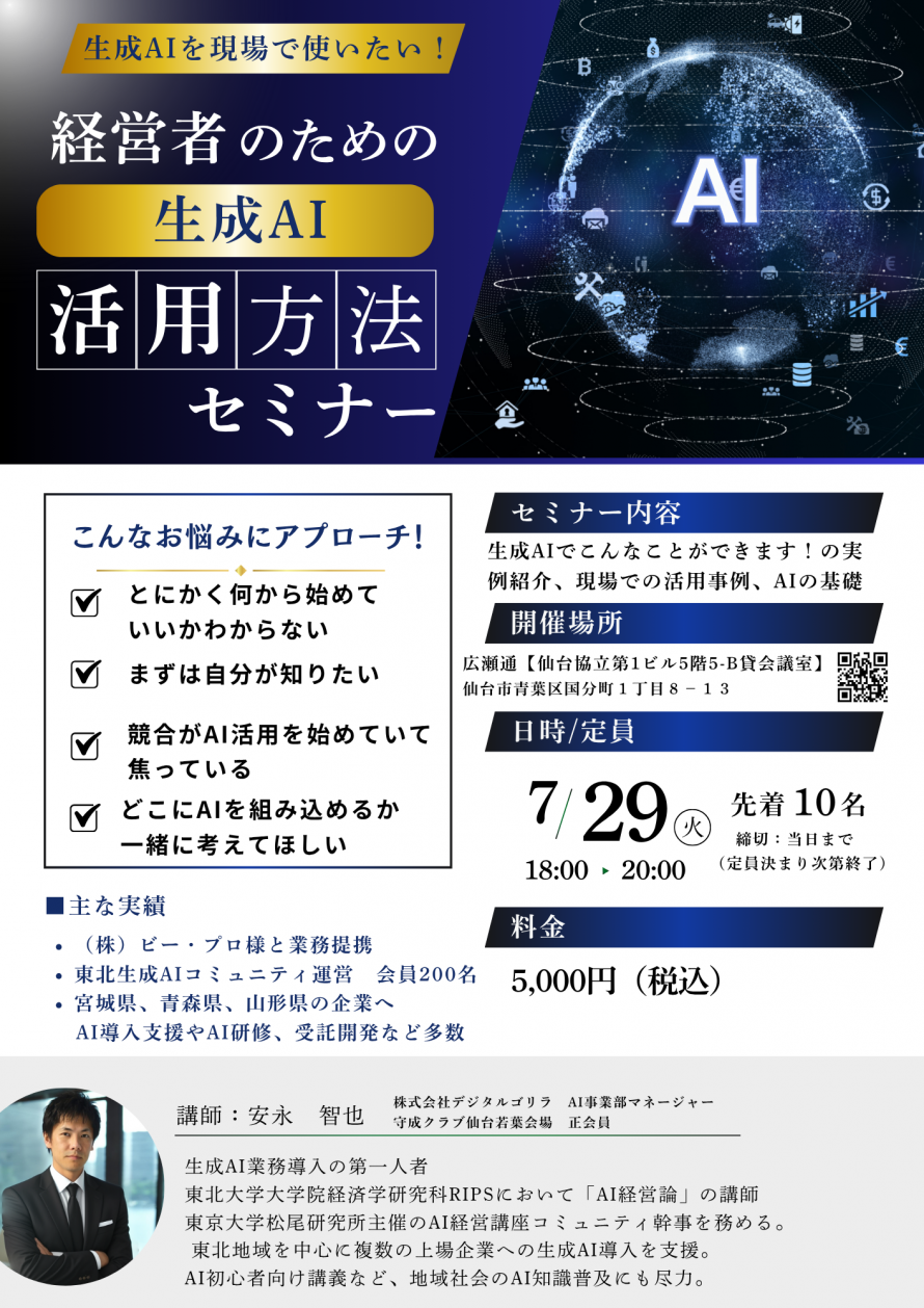 ・東北地域を中心に、複数の企業への生成AI導入支援やAI初心者向け講座を多数開催。