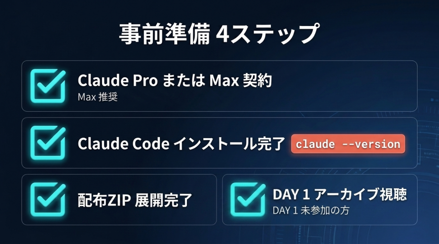 Q. DAY 1 に参加していないのですが、DAY 2 だけの参加でも大丈夫ですか? A. 問題ありません。DAY 1 未参加の方は、DAY 1 アーカイブ(7日間限定配信)を開催前にご視聴ください。DAY 2 当日は「Claude Code が自PCで動く状態」を前提に進めます。DAY 1 アーカイブで同じ状態までキャッチアップしていただければ、DAY 2 から合流できます。