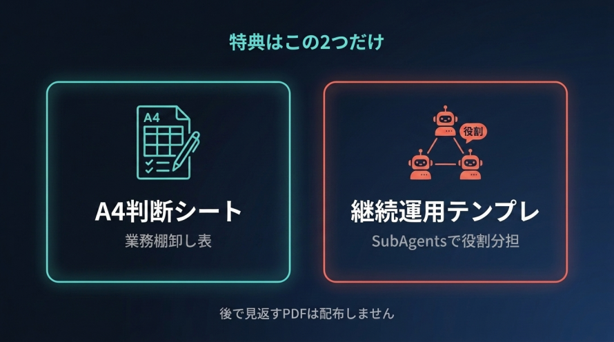 "後で見返すPDF資料"や大量のプロンプト集は配布しません。見返し前提の特典より、その場で一緒に使って完成させるワークシートのほうが、持ち帰り後の実装に直結するからです。