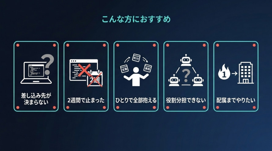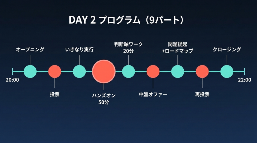 DAY 2 は、この DAY 1 で動かした"1つ"を土台にして自社配属の設計に進みます。DAY 1 未参加の方も、DAY 1 アーカイブ(7日間限定配信)を開催前にご視聴いただければ問題なく合流できます。