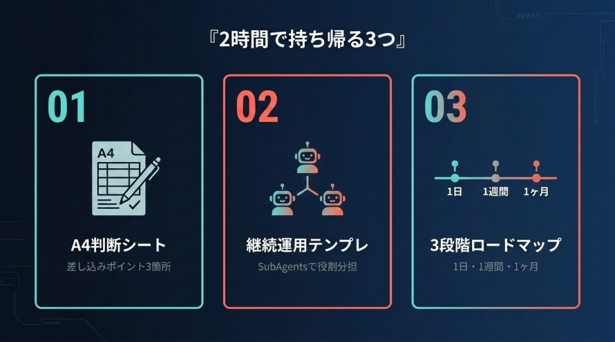 このワークショップ DAY 2 は、「使い方」ではなく「配属の設計」です。 22時には、自社業務にClaude Code × AI秘書をどう差し込むかの A4判断シート+継続運用テンプレートが手元にある状態になります。