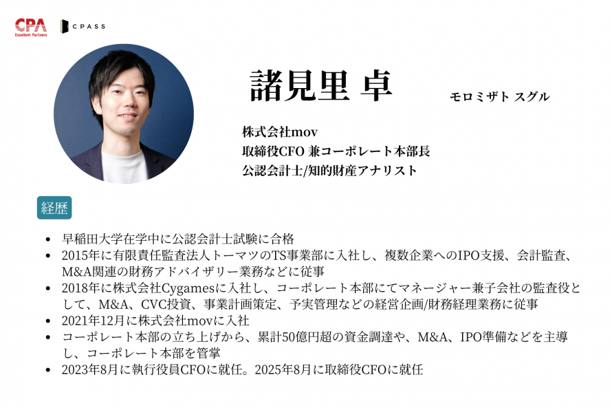 今回の『会計士のキャリア戦略セミナー』でお迎えするのは、監査法人にて会計監査、IPO支援やM&A関連の財務アドバイザリー業務などに従事したのち、株式会社Cygamesのコーポレート本部にてマネジャーとして経営企画、財務経理実務経験を経て、20代で株式会社movの執行役員CFOに抜擢され、現在同社の取締役CFO 兼コーポレート本部長としてご活躍中の諸見里卓氏です!本イベントでは『公認会計士がスタートアップで価値を出す方法』をテーマに、インタビュー形式でお話を伺います。