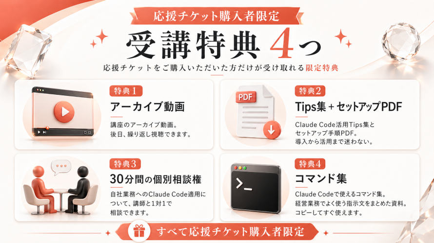 特典3:30分間の個別相談権(自社業務へのClaude Code適用について講師と1対1で相談できます)