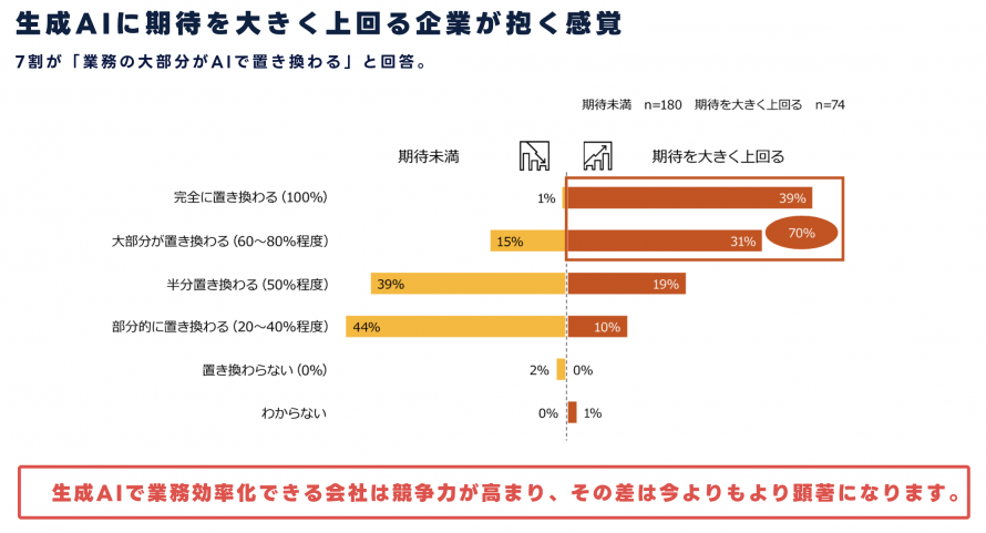 成果を出している企業の70%が「業務の60%以上がAIに置き換わる」と回答しています。