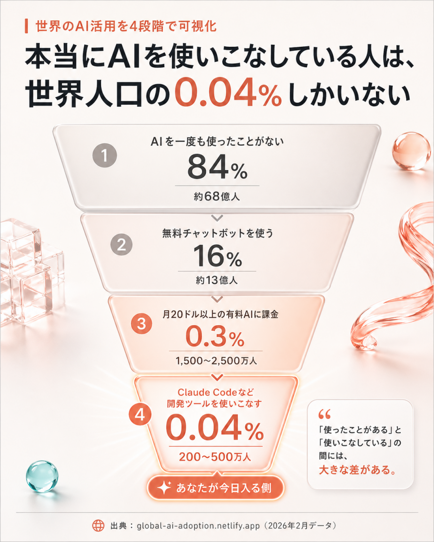 Claude Codeのような「AIに業務を実行させる開発環境」を使いこなしている人は、世界人口の約0.04%にとどまります。